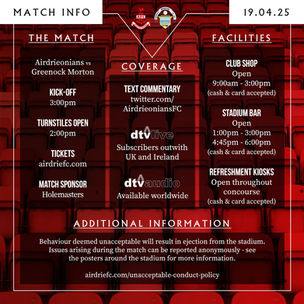 Aaron Reid (hamstring), and Cammy Bruce (knee) continue to miss out for Airdrie. Former Morton defender Lewis Strapp has resumed light training in a bid to return before the end of the season, and three players are being closely monitored after picking up knocks against Raith – while Alex Bannon is hoping to be available, Aidan Wilson and Lewis McGrattan remain major doubts for Saturday’s match.