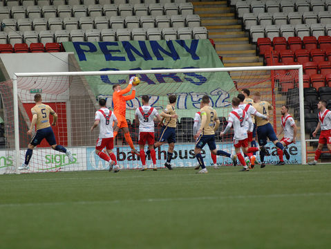Sean Crighton’s aerial prowess was causing problems from Airdrie setpieces as the skipper went close twice in a minute, first seeing a downward header blocked before connecting with the head again and seeing the angled effort come back off the post.